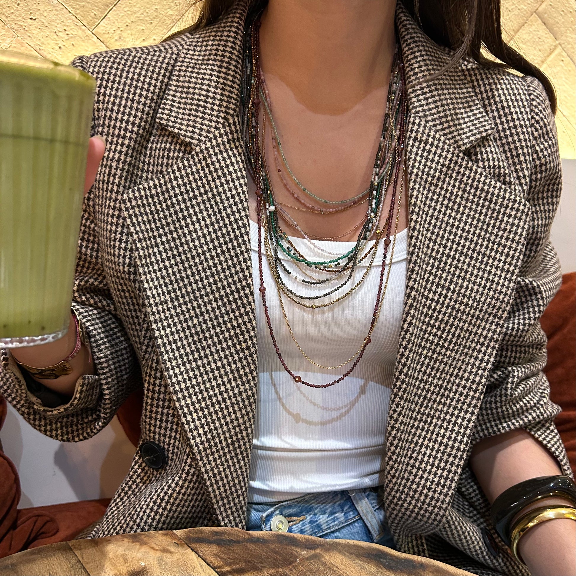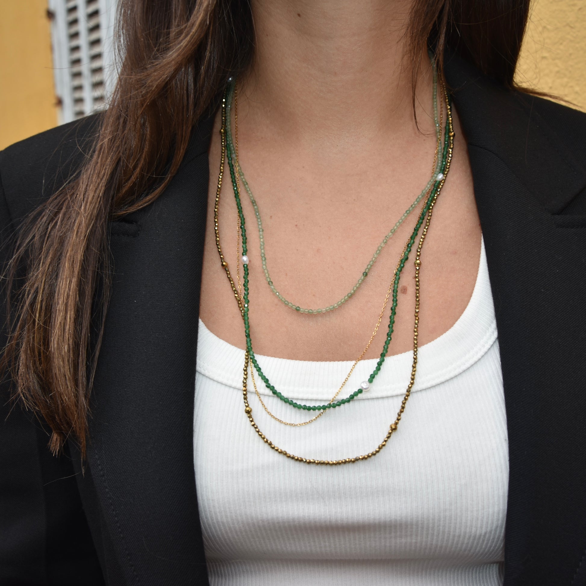 → Détails : perles en pierre naturelle à facettes émeraude, aventurine, spinelle dorée, perles d'eau douce et chaine fine en acier inoxydable.