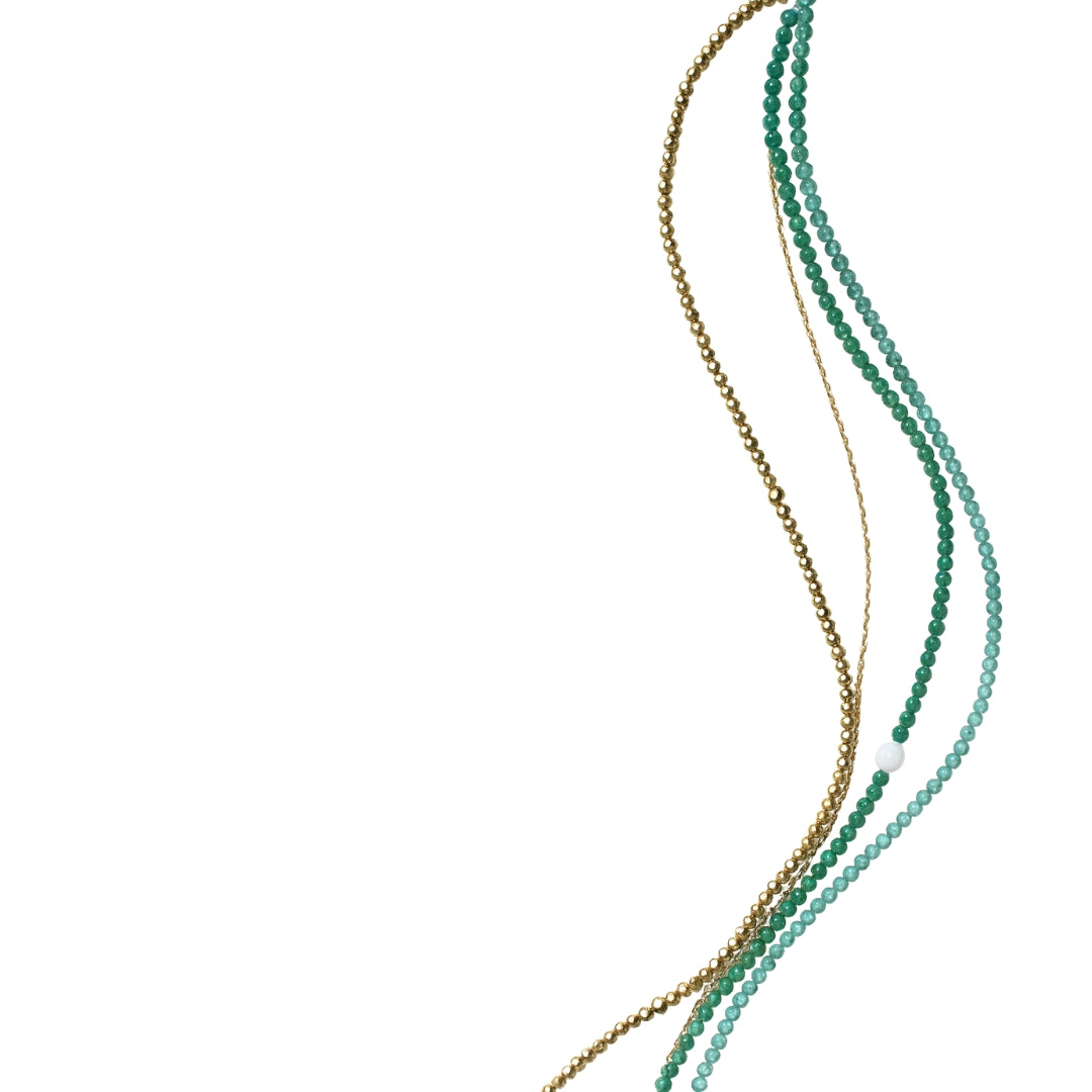 Le collier Gabrielle, pièce phare de la collection Autumn Solstice , s'inspire des couleurs profondes et végétales de la saison. Ses nuances de vert émeraude, mêlées à de fines chaînes dorées, apportent une touche de fraîcheur et d'élégance. Les perles de verre, délicatement assemblées, sont parfaites pour illuminer votre décolleté avec subtilité.